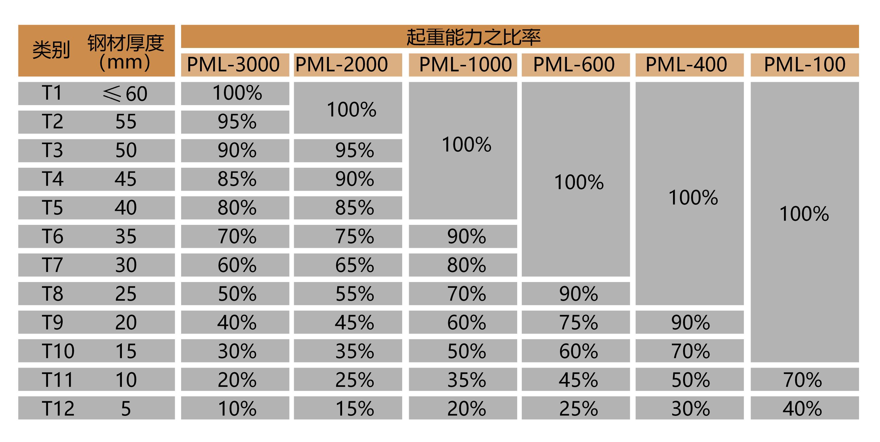 例:鋼板條件為T8、F1及M2,型號PML-600永磁起重器極限工作載荷為600kg,吊運此鋼板的實際起重能力如下: