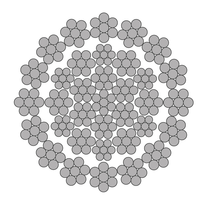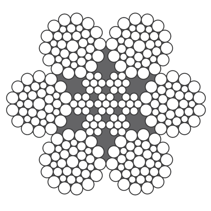 b) 半阻旋轉(zhuǎn)鋼絲繩,通常指兩層股與4V類鋼絲繩,如18×7、4V結(jié)構(gòu)鋼絲繩(圖3與圖4);