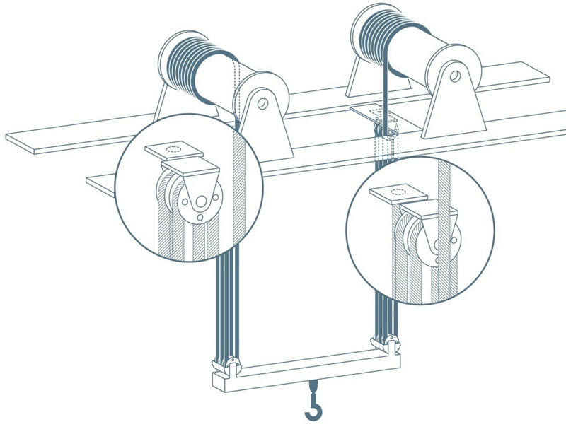 2) 在提升無導(dǎo)向載荷的情況下,如果成對設(shè)計(jì)使用左捻繩與右捻繩組合的鋼絲繩,則也可以使用非阻旋轉(zhuǎn)鋼絲繩(圖10與圖11)。