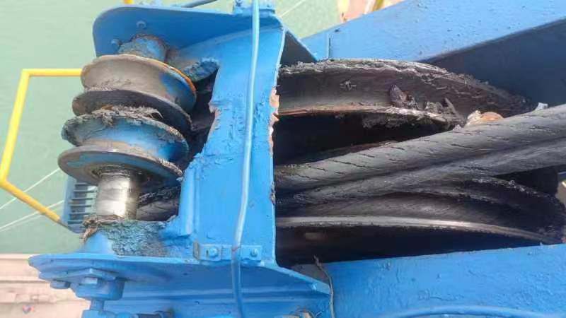 由于冬季氣溫低,鋼絲繩表面潤(rùn)滑脂變稠,其黏附性增強(qiáng)。港口起重機(jī)用鋼絲繩在選用時(shí),應(yīng)適當(dāng)減少鋼絲繩涂油量。尤其是散雜貨作業(yè)的門機(jī)與卸船機(jī),由于抓斗下降至船艙抓取貨物時(shí),起升繩此時(shí)為松弛狀態(tài),加上近海風(fēng)力較大,起升繩很容易與開(kāi)閉繩碰觸,當(dāng)出現(xiàn)此情況時(shí),起升繩可能與開(kāi)閉繩黏附一起,造成鋼絲繩彎折、跳槽等損傷現(xiàn)象(圖2與圖3)。
