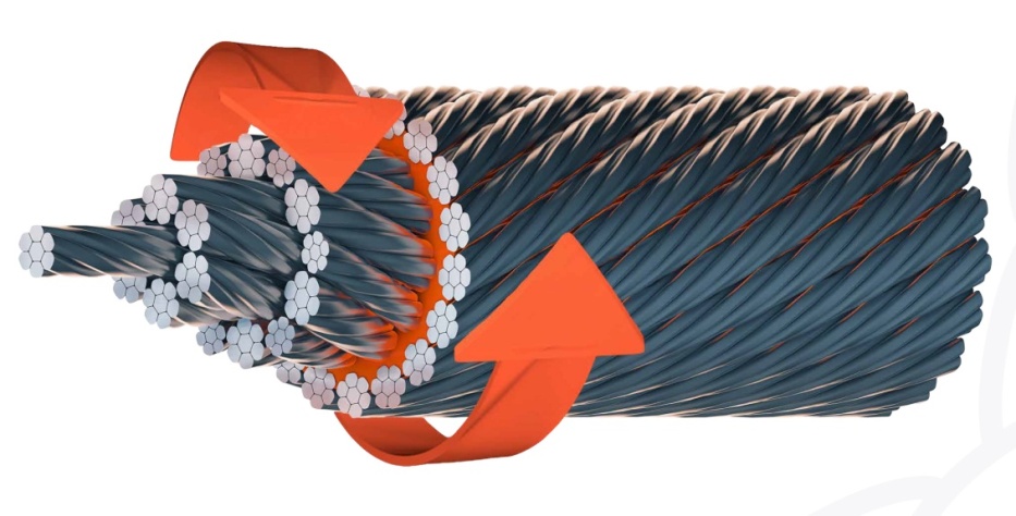 鋼絲繩應(yīng)選擇阻旋轉(zhuǎn)結(jié)構(gòu),例如35W×7(K7)、40W×7、15×K7等結(jié)構(gòu)(圖2),可以阻止鋼絲繩負(fù)載下結(jié)構(gòu)性旋轉(zhuǎn)。