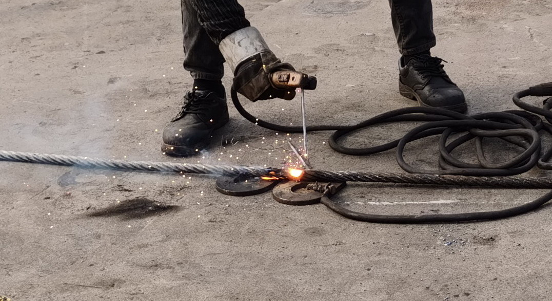 1) 使用舊繩牽引新繩安裝過(guò)程中,如果舊繩與新繩之間采用焊接等方式剛性連接(圖3),舊繩上殘留的部分扭轉(zhuǎn)應(yīng)力將傳遞到新繩上,可能引起扭轉(zhuǎn)應(yīng)力累積,最終造成吊鉤旋轉(zhuǎn)。