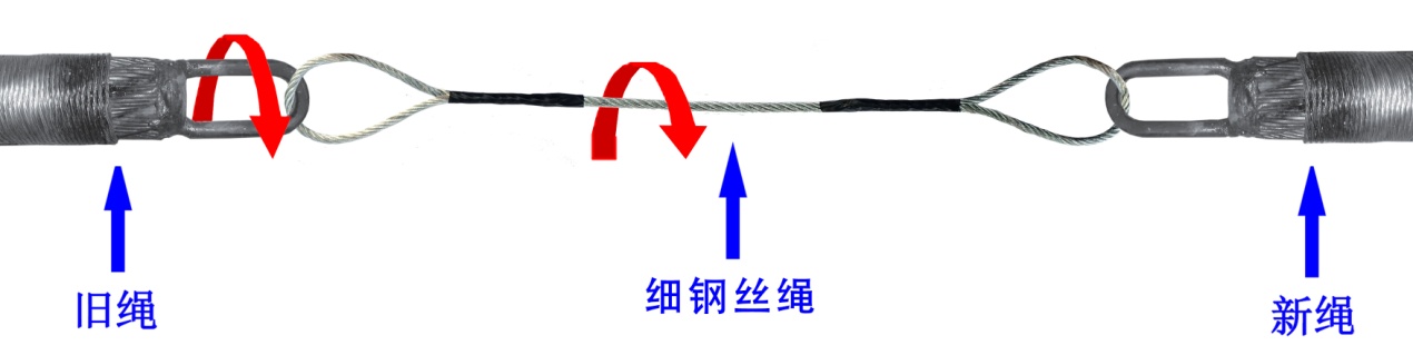 為了確保舊繩上殘留的扭轉(zhuǎn)應(yīng)力不會(huì)轉(zhuǎn)移到新繩上,可以通過(guò)使用輔助繩索吸收扭轉(zhuǎn)應(yīng)力,即在舊繩與新繩之間連接一根足夠強(qiáng)度的細(xì)鋼絲繩(圖4)。