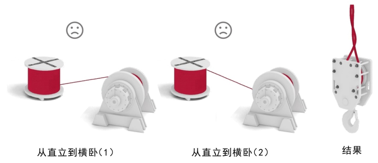2) 鋼絲繩從卷盤到卷筒使用不正確的繞繩方式,例如反向彎曲(圖5)、從直立到橫臥(圖6)等方式,這將帶入扭轉(zhuǎn)應(yīng)力,可能引起吊鉤旋轉(zhuǎn)。