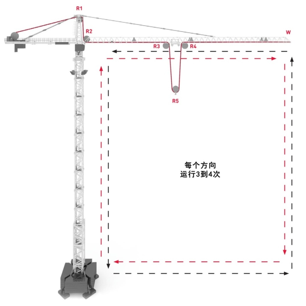 1. 操作塔吊小車與吊鉤運(yùn)行,如圖2所示,先按黑色虛線及箭頭方向循環(huán)操作3~4次,再按紅色虛線及箭頭方向循環(huán)操作3~4次,可以將鋼絲繩上部分扭轉(zhuǎn)應(yīng)力轉(zhuǎn)移至旋轉(zhuǎn)器(W)上,從而解決吊鉤旋轉(zhuǎn)問(wèn)題。