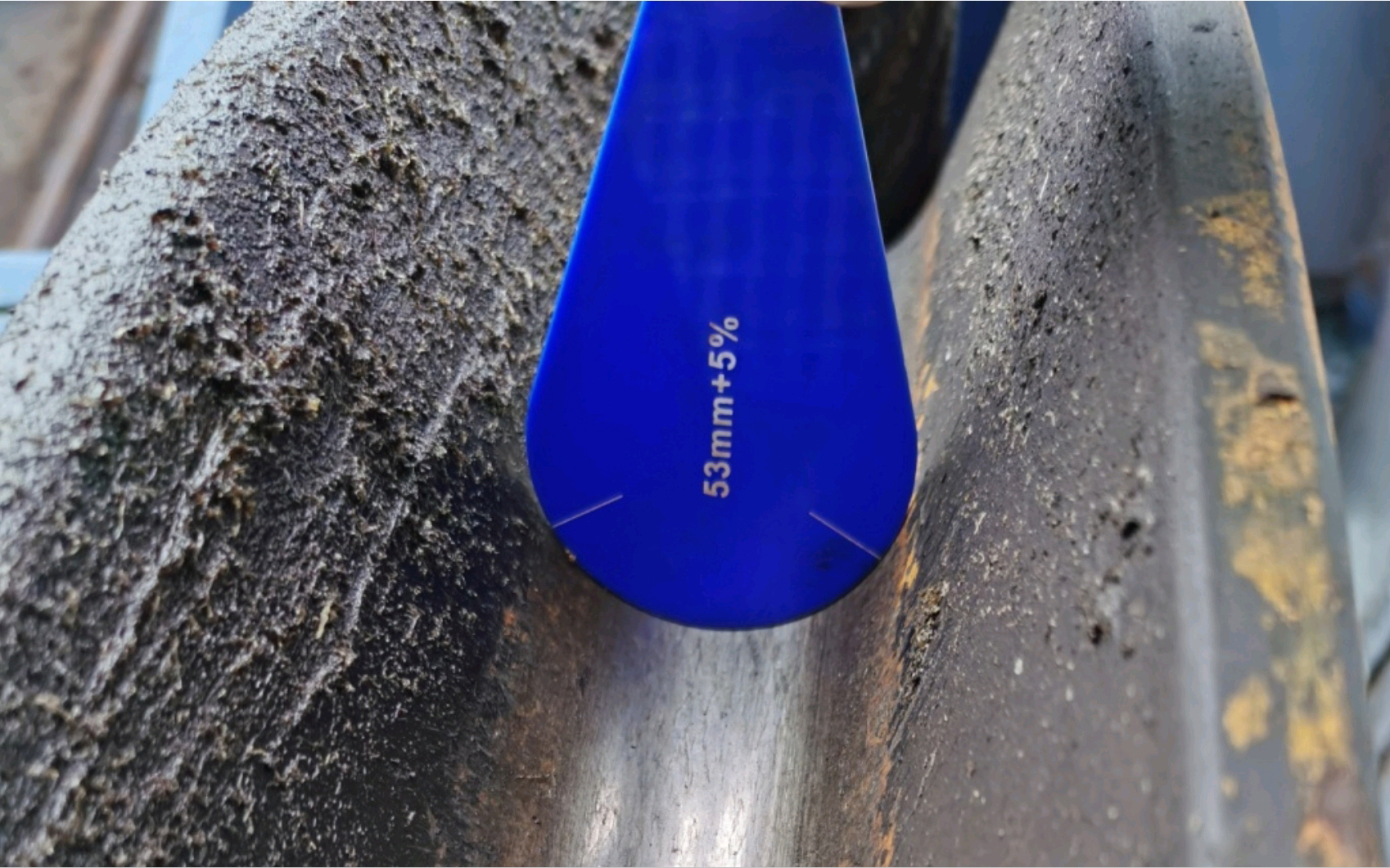 選擇與起重機(jī)用鋼絲繩公稱直徑符合的R規(guī)對(duì)繩槽進(jìn)行測(cè)量,R規(guī)測(cè)量時(shí)弧面應(yīng)貼合繩槽底部,并垂直于繩槽底部槽面。例如某卸船機(jī)設(shè)計(jì)使用的鋼絲繩公稱直徑為53mm,則選擇規(guī)格為53mm+5%(弧面直徑為53mm×1.05=55.65mm)的R規(guī)測(cè)量。圖2中R規(guī)半圓形部分上兩條白線范圍內(nèi)弧面正好與繩槽完全貼合,說(shuō)明繩槽直徑正常,符合公稱直徑53mm的鋼絲繩使用要求。