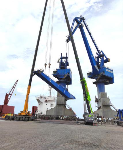 本項目施工技術(shù)難度大,要求短時間、高效率完成維修工作。根據(jù)隨機資料顯示:象鼻梁結(jié)構(gòu)自重高達(dá)7947.1KG,大拉桿自重34745.02KG,大臂自重46790.34KG,當(dāng)門機處于最大幅度45M時,門機高度約為57M,當(dāng)門機處于最小幅度12.5M時,門機高度約為69.3M。根據(jù)各部件的自重及高度,結(jié)合現(xiàn)場門機由于故障無法打至最大幅度的特點,項目使用了起重量為500T和260T的2臺全路面汽車吊配合裝卸作業(yè)。