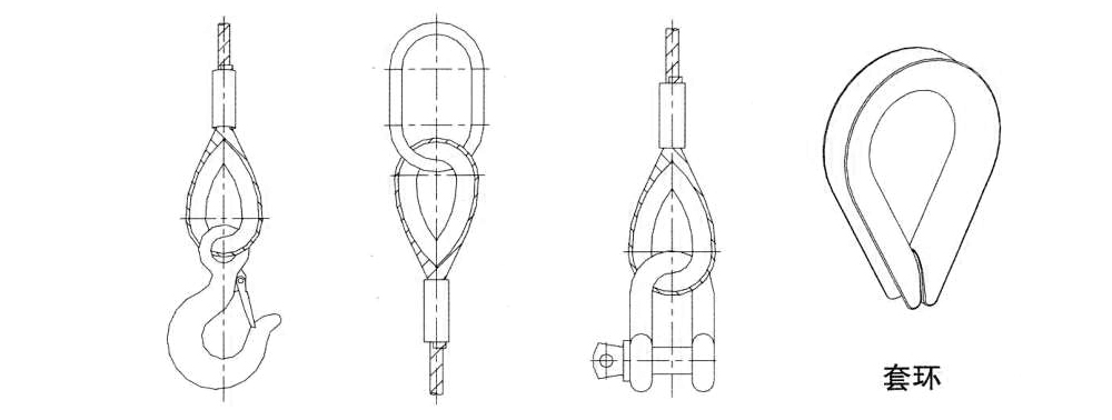 1、成套鋼絲繩索具與吊鉤、吊環(huán)、卸扣等達(dá)接處,是最容易受仿的地方,可加套環(huán)進(jìn)行保護(hù),延長(zhǎng)索具的使用壽命。(以壓制鋼絲繩索具為例,插編鋼絲繩索具同理)