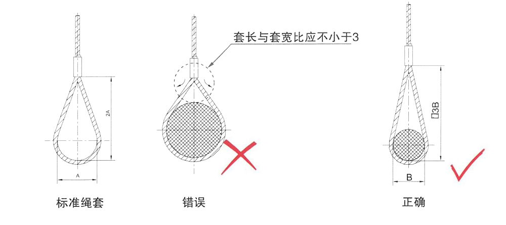 如吊耳過(guò)大,會(huì)使繩套夾角過(guò)大,在承重時(shí),鋁管產(chǎn)生外張力,致使繩套抽發(fā)生危險(xiǎn)。應(yīng)按右圖所示,加大繩套長(zhǎng)度,最好在受力狀態(tài)下,繩套的套長(zhǎng)與套寬之比不小于3。(以壓制鋼絲繩索具為例,插編鋼絲繩索具同理)