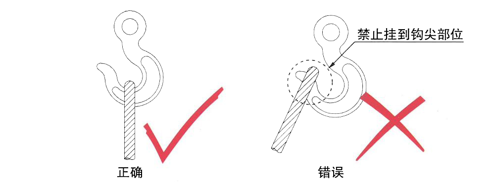 3、兩根鋼絲繩索具使用時(shí),將兩根鋼絲繩索具直接掛入雙鉤內(nèi),兩根鋼絲繩索具各掛在雙鉤對(duì)稱(chēng)受力中心位置;四根鋼絲繩索具使用時(shí),每?jī)筛摻z繩素具直接掛入雙鉤時(shí),注意鉤內(nèi)兩根鋼絲繩索具不能產(chǎn)生重疊和相互擠壓,四根鋼絲繩索具要對(duì)稱(chēng)于吊鉤受力中心,如圖: