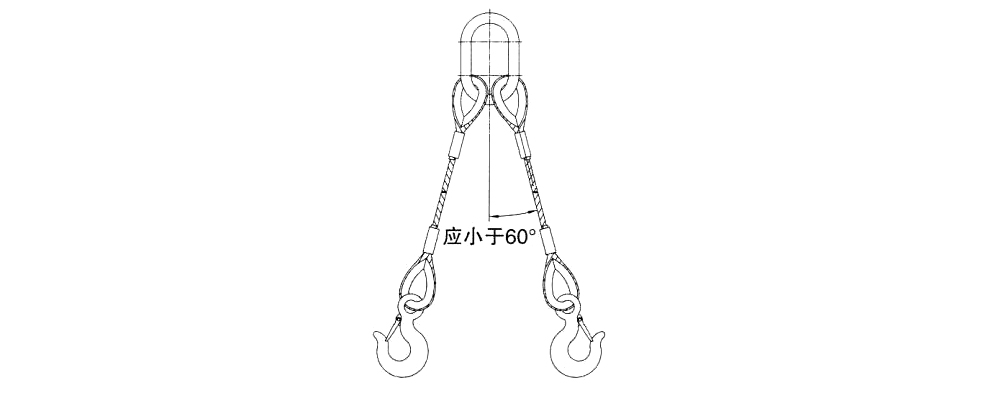 4、成套索具吊裝時(shí)應(yīng)避免吊裝角度超過(guò)60°。(以壓制鋼絲繩索具為例,插編鋼絲繩索具同理)