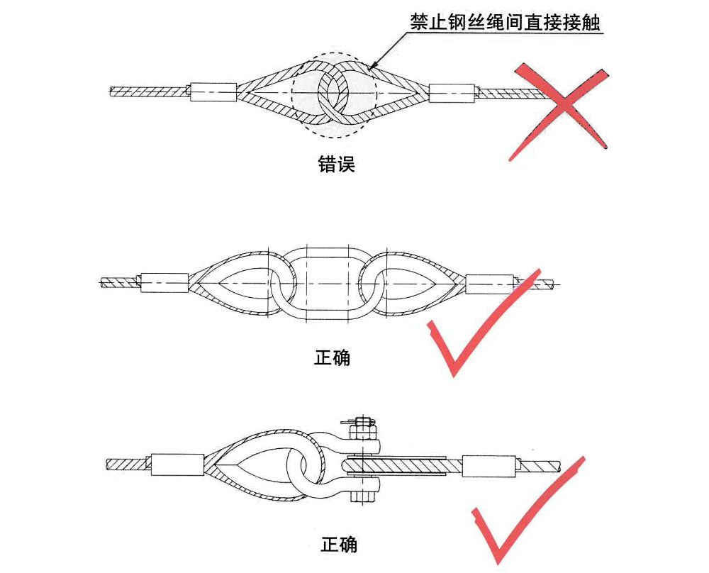 5、鋼絲繩索具禁止打結(jié),止鋼絲繩間直接接觸,應(yīng)加卸扣成吊環(huán)隔開(kāi)。(以壓制鋼絲繩索具為例,插編鋼絲繩索具同理)