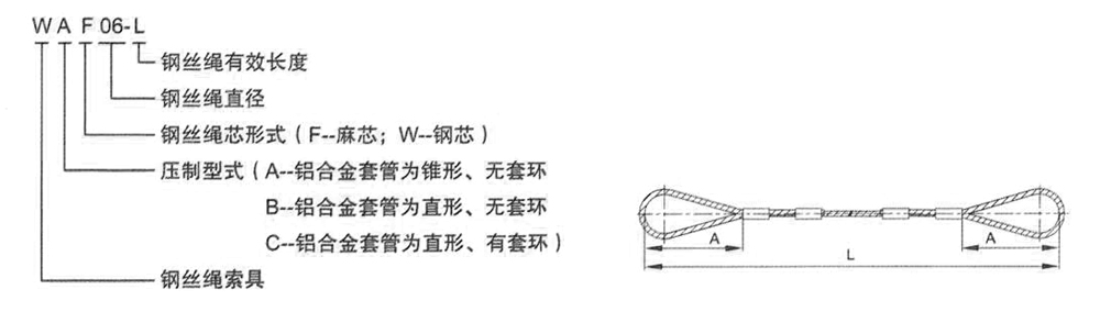 直徑φ90以上壓制鋼絲繩索具形式為毎端壓制兩個(gè)鋁合金壓制接頭;