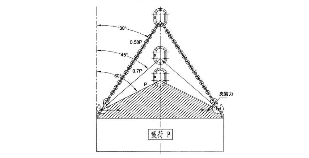 1、鏈條及鏈條索具在使用前,須看清標牌上的工作載荷及適用范圍,嚴禁超載使用,并對鏈條索具做目測檢查符合后方可使用。2、在正常的使用情況下,吊裝角度是影響載荷的關鍵,圖中陰影部分夾角最大不準超過120度,否則將造成鏈條索具局部過載。