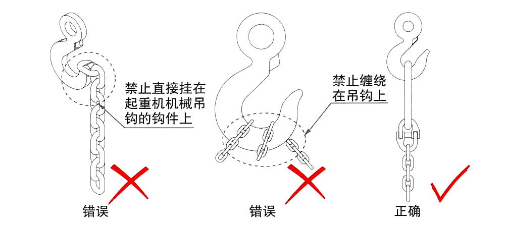 4、承載鏈條索具禁止直接掛在起重機吊鉤的鉤件上或纏繞在吊鉤上。