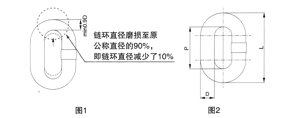 1、鏈環(huán)直徑磨損至原公稱直徑的90%,即鏈環(huán)直徑少了10%,應更換部件或報廢;(如圖1)。