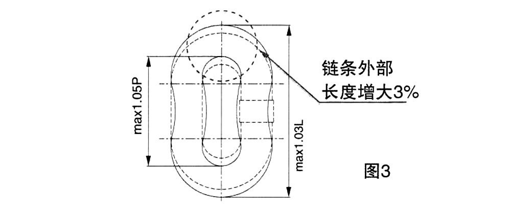 2、鏈條外部長度增大3%,即鏈條內部拉長5%,應更換部件或報廢(如圖3)