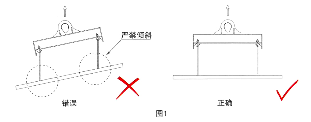 2、必須確保起吊時負載不超過極限額定載荷,吊運過程中,吊具應(yīng)處于平衡狀態(tài)(如圖1)。