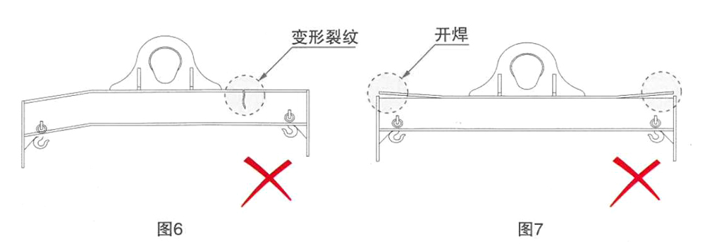 1、吊具梁體、吊耳有明顯變形及裂紋應(yīng)及時報廢(如圖6);