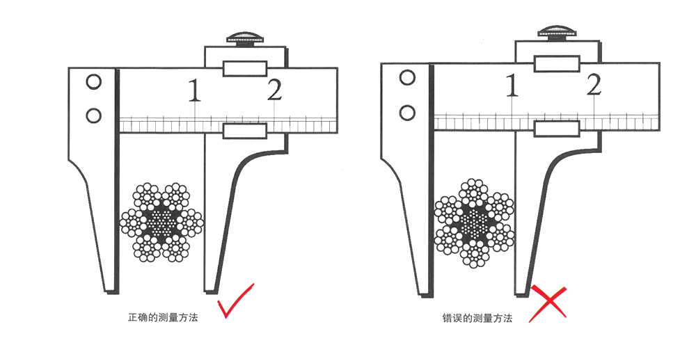 如下圖所示,鋼絲繩直徑的測(cè)量方法正確與否。所得到的測(cè)量數(shù)據(jù)將會(huì)截然不同。