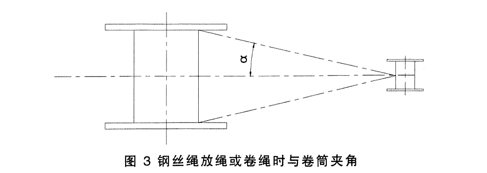 2、鋼絲繩放繩或卷繩是與卷筒夾角,無(wú)槽的卷筒夾角小于1.5°。有槽的卷筒夾角小于2.5°,見(jiàn)圖