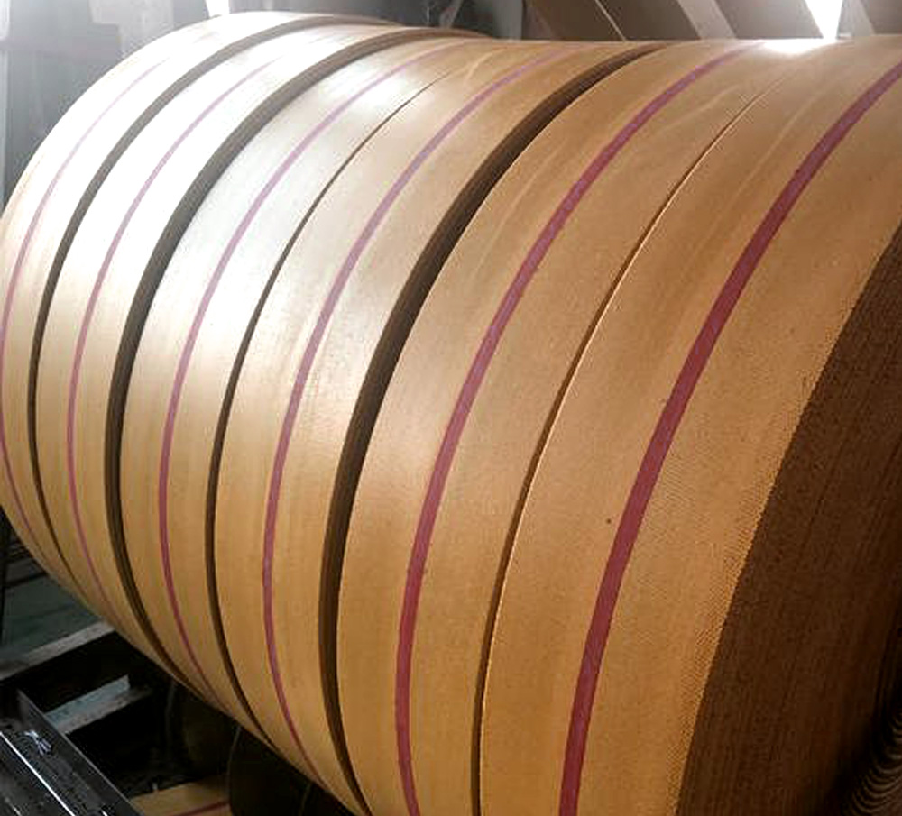 普通平膠帶又稱為傳動(dòng)帶,一般分為包邊式和切邊式兩種,采用優(yōu)質(zhì)全棉帆布作為骨架層,帆布表面擦、貼適量膠料后,再由多層膠帆布粘合在一起構(gòu)成平膠帶,平膠帶具有強(qiáng)度高、耐老化、屈撓性能好、使用伸長(zhǎng)率小等優(yōu)良性能。