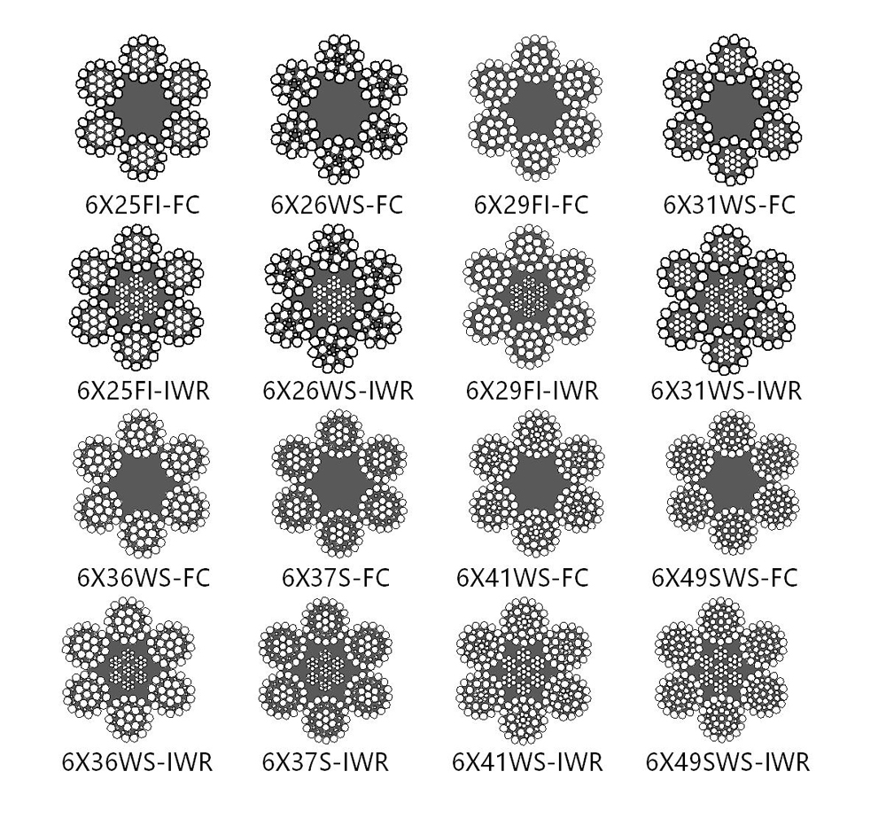 Wire rope structure: 6X25FI 6X29FI 6X26WS 6X31WS 6X36WS 6X37S 6X41WS 6X49SWS